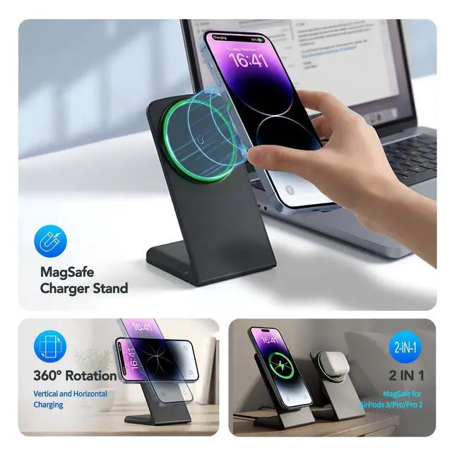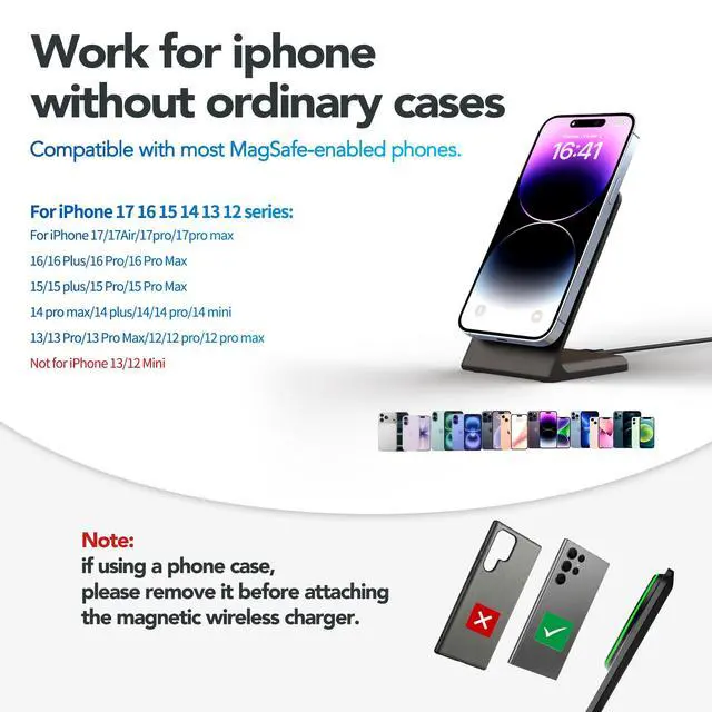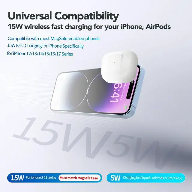 Compatible with the following Apple iPhone models:iPhone 17, iPhone 17 Pro, iPhone 17 Air, iPhone 17 Pro Max, iPhone 16, iPhone 16 Pro, iPhone 16 Plus, iPhone 16 Pro Max, iPhone 15, iPhone 15 Pro, iPhone 15 Plus, iPhone 15 Pro Max, iPhone 14, iPhone 14 Pro, iPhone 14 Plus, iPhone 14 Pro Max, iPhone 13, iPhone 13 Pro, iPhone 13 Pro Max, iPhone 12, iPhone 12 Pro, and iPhone 12 Pro Max., plus AirPods 3/Pro/Pro 2. To ensure a better experience and precise magnetic alignment, a magnetic phone case or no case is required. Not compatible with standard cases.