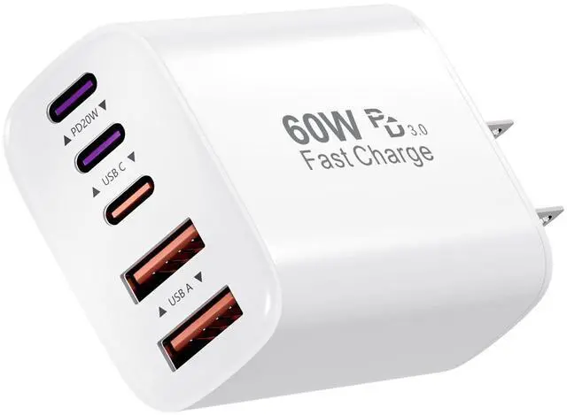 USB C Fast Wall Charger Block, 60W 5-Port USBC Wall Charger iPhone Charger Fast Charging PD Power Adapter+QC Wall Plug Multiport Type C Brick Charger for iPhone 17 16 15 14Pro Max,Samsung-1Pack