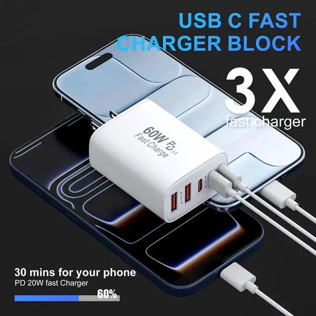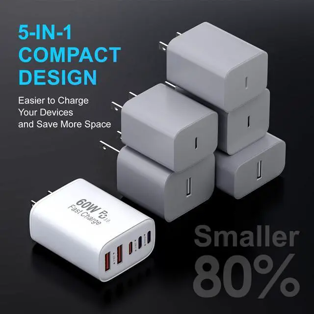 USB C Fast Wall Charger Block, 60W 5-Port USBC Wall Charger iPhone Charger Fast Charging PD Power Adapter+QC Wall Plug Multiport Type C Brick Charger for iPhone 17 16 15 14Pro Max, Samsung-1Pack