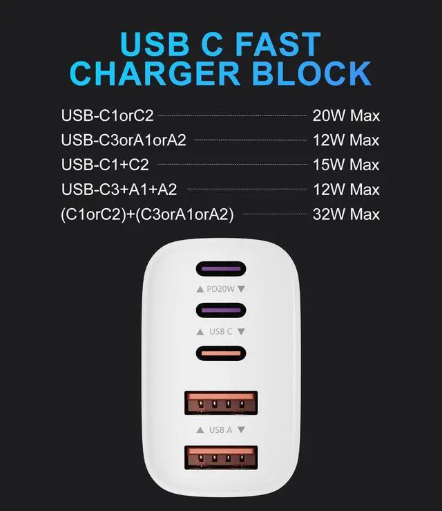 5 Port USB ChargerDesigned for the Latest iPhone Models, including iPhone 17 16 15 14. With a total of 65W power output across 5 ports (3 USB-C + 2 USB-A), allowing you to charge up to 6 devices simultaneously
