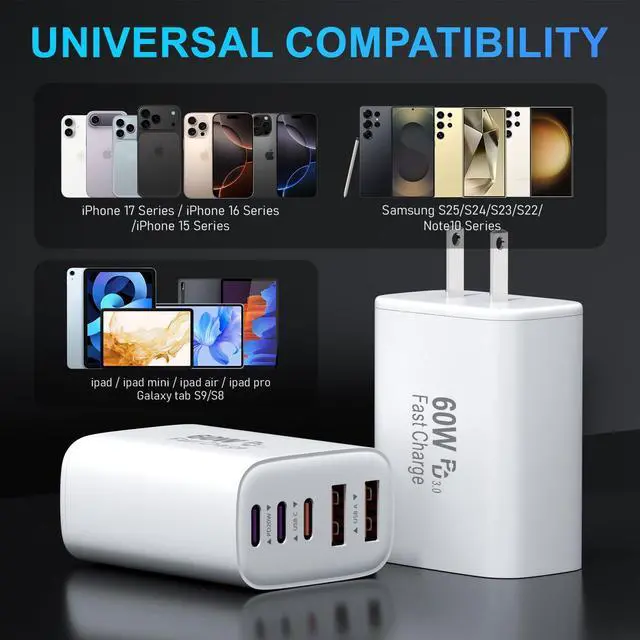 Universal CompatibilityOne charger for all, the c type charger block great compatible for iPhone 17/17 Pro/ 17 Pro Max/17 Plus/16/16 Pro/ 16 Pro Max/16 Plus/15/15 Pro/ 15 Pro Max/15 Plus/14/14 Plus/14 Pro/14 Pro Max/iPhone 13/13 Pro Max/iPhone 12/12 Mini/12 Pro/12 Pro Max /XR/XS/X/8/7 ,Samsung Galaxy S25/S24/S23/S22/S21/S20/S10/S9/A12/,LG, Moto and more