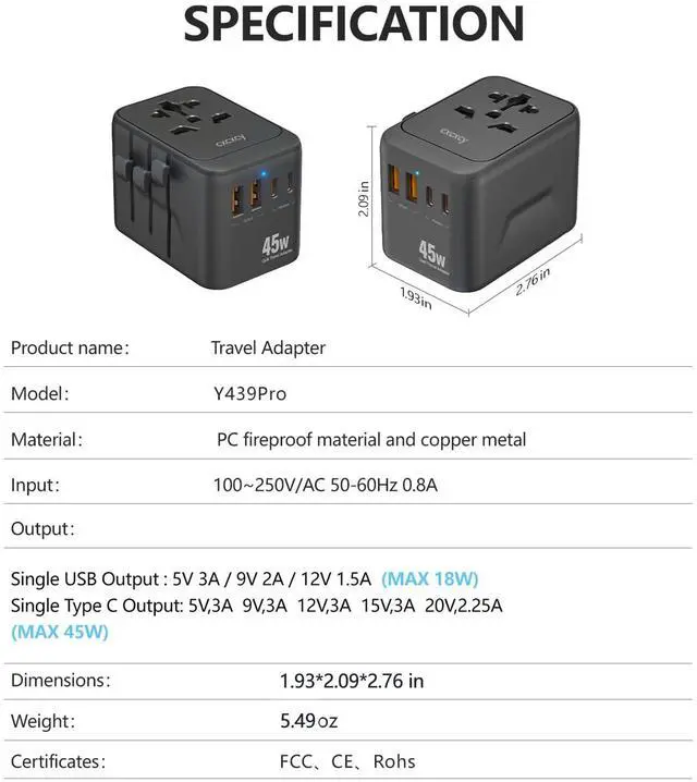Type A, Type C, Type G, Type I, 110 volts_of_alternating_current, 5 volts_of_direct_current, 5, 1.93 L x 2.09 W x 2.76 H inches, y439pro, cxcxcy, black, 1year Manufacturer