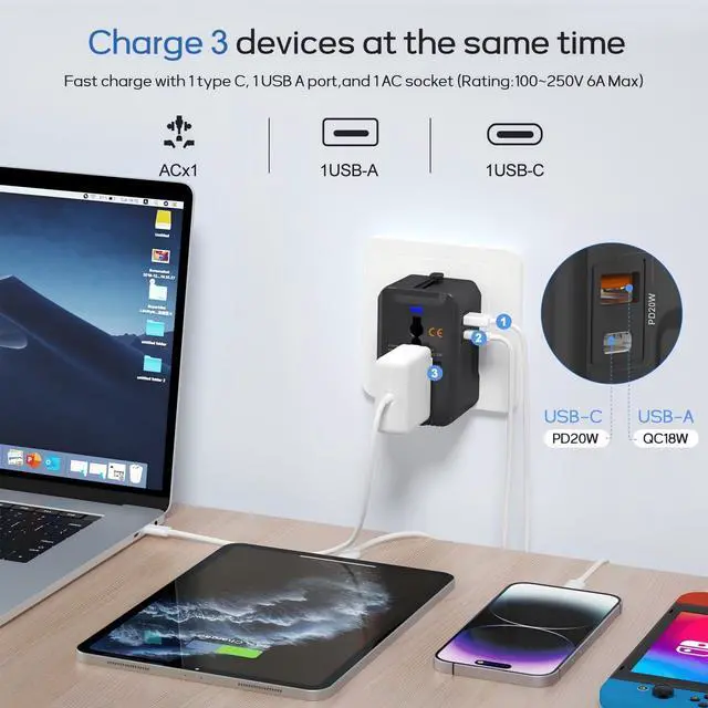 • [20W Fast Charging for Popular Smart Devices ] Features efficient fast-charging tech, delivering better power transmission than traditional chargers. Equipped with 1 USB-C PD port, 1 USB-A port, and 1 AC outlet (max 660W at 110V / max 1440W at 250V), its compatible with mainstream fast-charging protocols. The USB-C port supports 20W fast chargingcharges iPhone 16 from 0 to over 50% in 30 minutes. Perfect for quickly topping up phones, tablets, and more during travel, cutting down charging wait time significantly. Ideal as a multi-port travel charger.