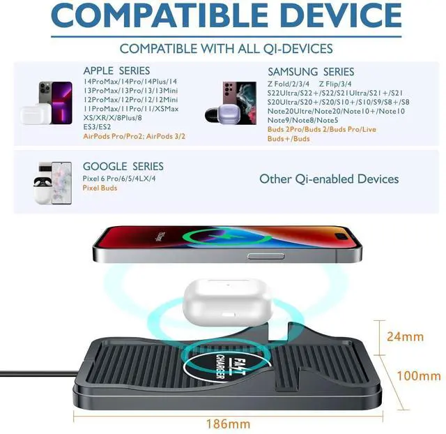The wireless charger is a Qi cordless charging pad & phone stand mount combination that you can use as a charger or holder on car , table or other places; It's a universal car charger mat for all wireless enabled smart cell phones such as iPhone 15, 14 , 13 ,12 MINI 11 Pro Max 8 Plus X XS XR / Samsung Galaxy S23 S22 S21 S20 S20+ S10 S9 S8 S10+ S9+ S8+ S7 edge S6 edge+ / Note 21 20 10 7 5 FE 9/8, Xperia Xz2 Xz3 Xz4 , MOTO Z , LG G8 G7 V50 V40 V30 ThinQ G6 G6+ G4 G3 G2 etc. charging wirelessly on your Mazda, LX Lexus, BMW , Tesla Model 3/Y, Nissan Altima, Honda Civic/ Accord, Toyota Camry/Corolla/Tacoma, Chevrolet Silverado, Ford Escape / F-Series etc. with the flat dashboard surface.