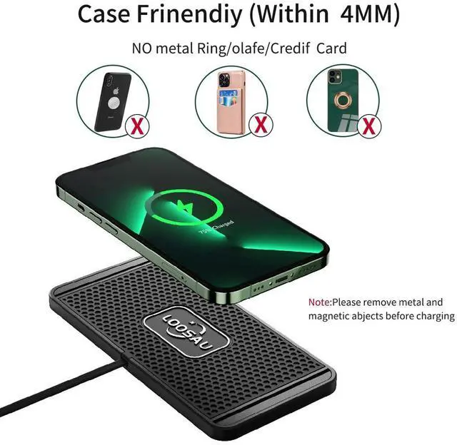 LOOSAU C2Y car wireless charger charges through phone cases that are no thicker than 4 mmHowever, items such as magnetic / metal attachments, grips, stands, keys, or credit cards will interfere with charging. Charging speeds may also be reduced while charging with a phone case.