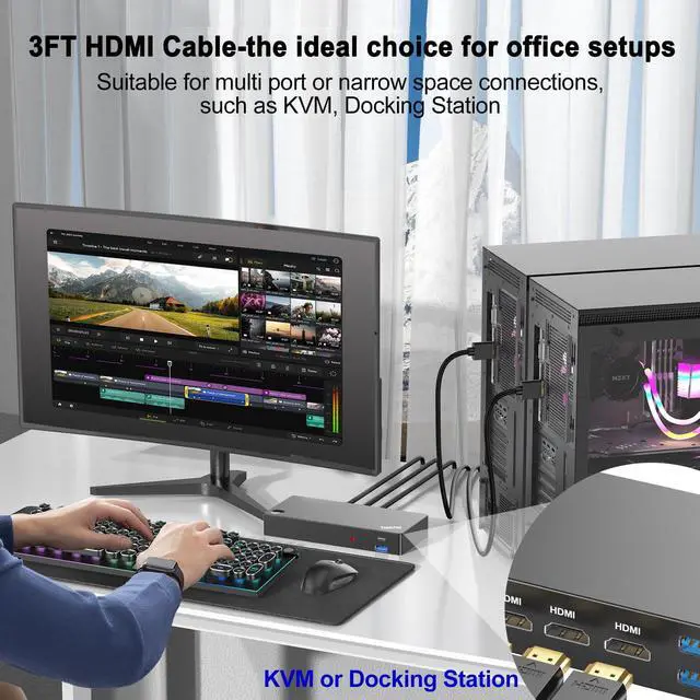 Simple and Compact HDMI CableThe simple and exquisite design is perfectly suitable for multi interface devices or devices in small spaces.making it simple to route around gaming desks, wall-mounted monitors, or tight PC setups. Easily connect your splitter, hub, KVM or Docking Station,multiport laptop and working amazing