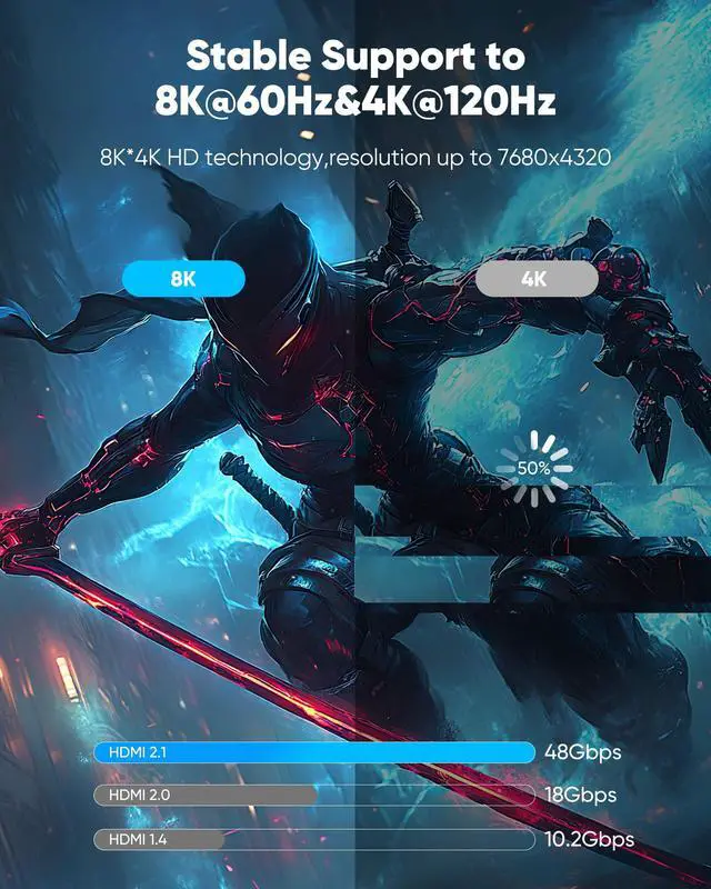 Crystal-Clear Visuals: Experience Unmatched 8K Clarity Elevate your home entertainment with our 8K HDMI cable 10ft(3M) . Supporting 48Gbps High Speed, indulge in seamless transitions between 8K@60Hz and 4K@120Hz resolutions for crystal-clear visuals. Experience the vibrancy of Dynamic HDR, immersive 3D visuals, and HDCP2.2 compliance for an unparalleled viewing experience