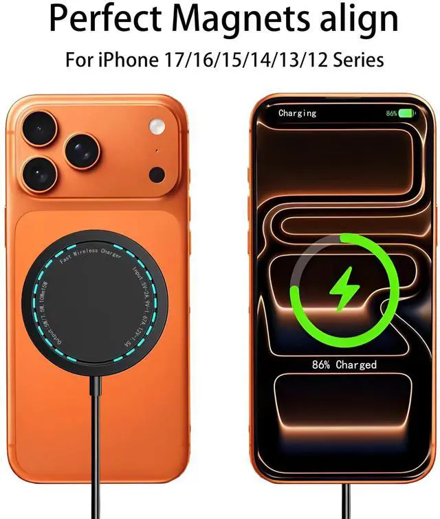 The magnetic wireless charger makes wireless charging a breeze. Simply place it gently on your iPhone 12 or newer models, and the perfectly aligned magnets will attach, providing up to 15W of fast wireless charging.
