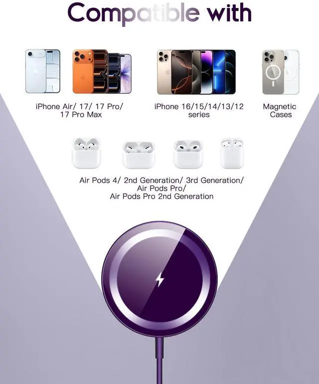 /////: Specially Designed for iPhone 17/17 Pro/17 Pro Max/Air/16/16 Plus/16 Pro/16 Pro Max/15/15 Plus/15 Pro/15 Pro Max/14/14 Plus/14 Pro/14 Pro Max/13/13 Mini/13 Pro/13 Pro Max/12/12 Mini/12 Pro/12 Pro Max and for Apple Mag-Safe cases. Besides, its compatible with all wireless-charging-enabled devices when laid flat, so youll conveniently charge your AirPods, other phones support wireless charging function and other accessories.