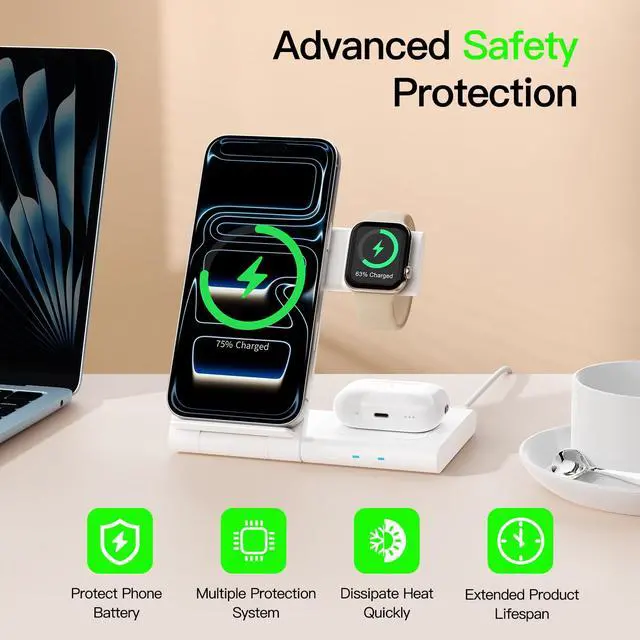 3 in 1 Wireless Charger : Is the ultimate 3-in-1 charging solution for all Apple devices and other models.Simultaneously charge your iPhone, Apple Watch and Air Pods, with a quick 2.5-3 hour full charge to meet all your charging needs at once (Note: (mobile phone case try not to exceed the thickness of more than 2mm to avoid charging).