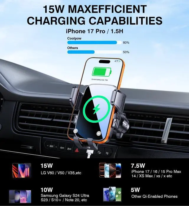 15W Wireless Fast Charging for LG V50/V40/V30/G8/G7; 10W for Samsung Galaxy S25/S24/ S23 Ultra/S23+/S23/S22 Ultra/S22/S21/S20/Note 20; 7.5W for iPhone 17 Pro Max 16 15 14 13 12 Note:Fast Charging requires QC 3.0 car charger (NOT INCLUDED)