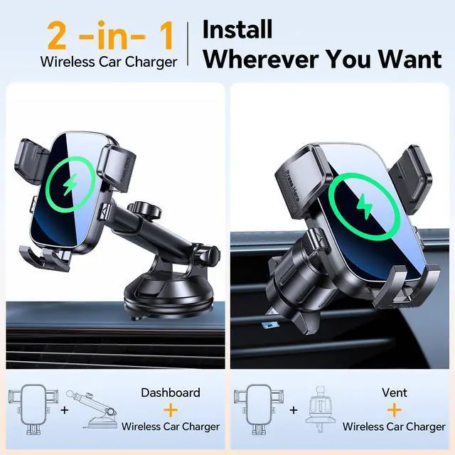 Why choose this 2-in-1 Car Charger Mount ? Flexible vent base or Suction cup base mean you can find the most stable, suitable and convenient base for any car model.The most cost-effective and convenient option.Each installation model is the best design on the market!