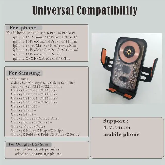 15W WIRELESS CAR CHARGER:Wireless car charger mount charges your wireless smartphone on the go and optimizes the power output delivery. It offers 15W Max Charging Speed for LG V50/V40/V30+, 10W Charging Speed for Samsung Galaxy S26 Ultra S25 S24 Ultra / S23 / S22 / S21+ / S20 / Note 10+, 7.5W Charging Speed for iPhone 17/16/15/14/13/12 Pro Max/11 / XS Max/XS, 5W for Other wireless charger Phones. For 15W 10W, 7.5W CHARGING MODE, QC 3.0 CAR CHARGER ADAPTER (not in the package) is Necessary as its power source. Includes 1 USB-C charging cable, and only 1 port provides power and can only charge one device at a time