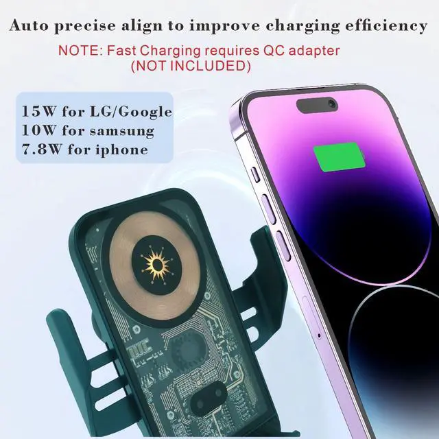 Smart sensing wireless casensing wireless car chargerThis fast wireless car charger mount is smart sensing,Very sensitive sensing,2 Way to use it. When mobile phone near the mount it can be automatic openning or automatic closing after power on ,also can touch the side button to open or close the bracket arm. It is simple operation and firm clamping. 15W Cell Phone Fast Wireless Charger holder,Requires QC 3.0 Car Charger Adapter (not included) for fast charging. Includes 1pcs USB to Type-C cable
