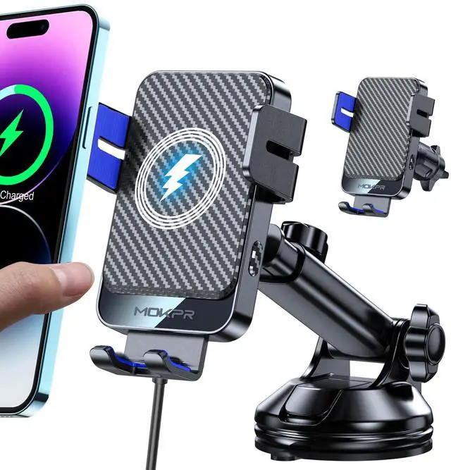 3-in-1, Suitable for All Cars The panel of the phone holder charger is made of carbon fiber, it allows you to install it on the dashboard, windshield or vent. This wireless car phone holder charger provides you with a simple way to securely fix your phone in place, Simple and stylish and is ideal for cars, trucks, SUVs, etc.