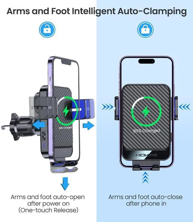Arms and Foot Auto Clamping TogetherThe car phone holder mount wireless charging's arms and foot will auto-opening after connecting to power, and will auto clamping firmly once place your phone inside, don't need to manually adjust the foot to clamp the phone.