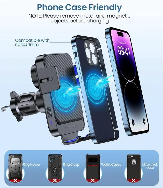 Intelligent Fast Wireless Car ChargerWireless car charger mount intelligently identify and charges your device in safe. Just place your Phone against the wireless car charger mount, it will auto-lock aligned with the charging coil to max 15W fast and more stable charging.