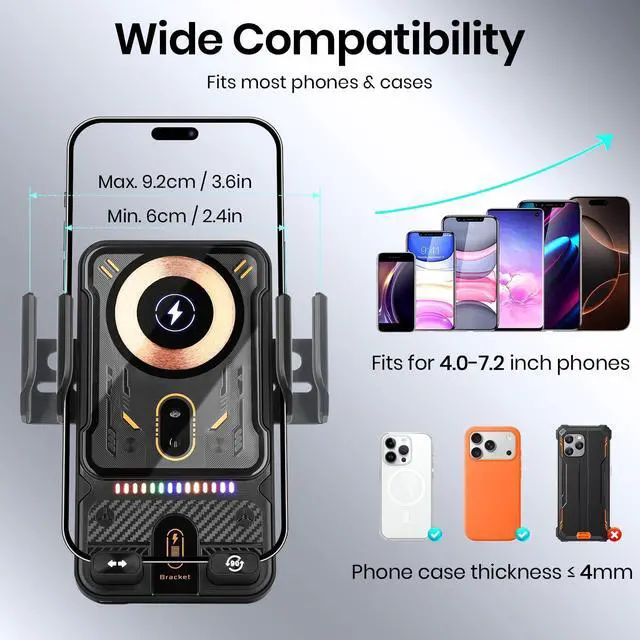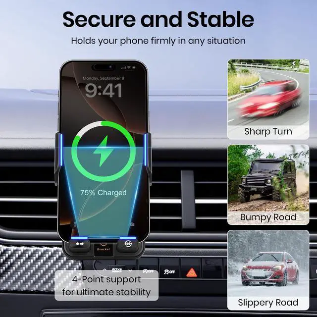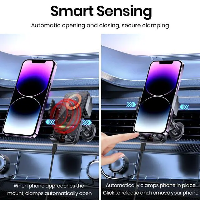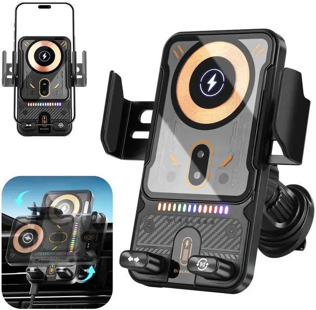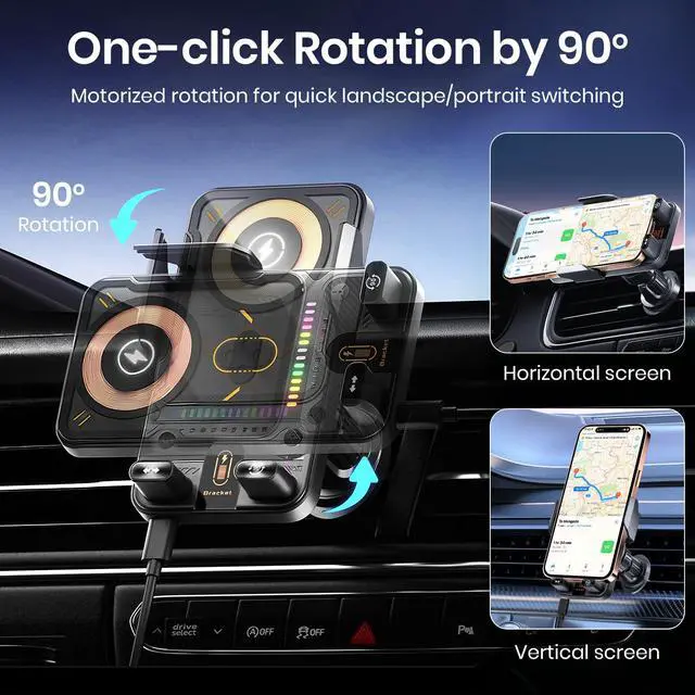 Transform your driving experience with this cutting-edge car phone holder that combines convenience and innovation. Featuring electric induction technology, the mount automatically opens and closes to securely grip your device. The advanced motorized mechanism allows smooth rotation between horizontal and vertical orientations, giving you the perfect viewing angle for navigation or entertainment. Enhanced with 15w wireless charging capability. The sturdy construction and secure mounting system ensure your phone stays firmly in place during your journey. With its smart design incorporating automatic functions, this phone holder eliminates the hassle of manual adjustments, letting you focus on the road ahead. Perfect for any car interior, this mount combines functionality with sophisticated design to deliver an exceptional mobile device solution for drivers.