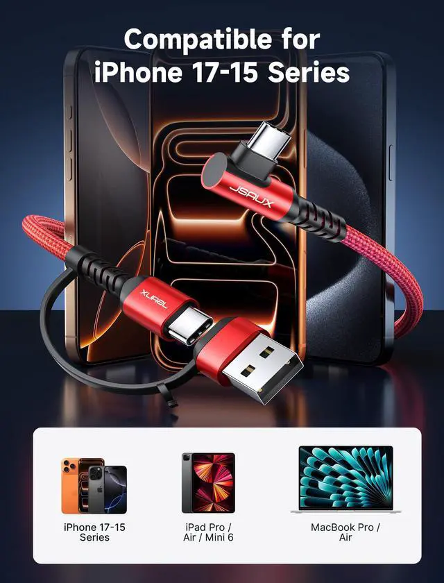 ![Main image of 100W USB C Cable [2-Pack 10FT], Right Angle Fast Charging Cord with USB A to C Adapter for iPhone Air/iPhone 17/ iPhone 17 Pro/iPhone 17 Pro Max, iPhone 16/15, Samsung, MacBook, iPad - Red](https://c1.neweggimages.com/productimage/nb640/C6EHD2604220GDQPQC0.jpg)