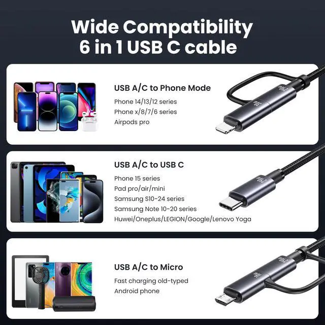 ![]() 100W 6-in-1 cable | ![]() 60W usb c 2-in-1 cable | ![]() 60W 4-in-1 charging cable | ![]() 100W charging cable | ![]() 6.6FT charging cable | ![]() 2pack short 4 in 1 cable | ![]() 2pack long 4 in 1 cable |