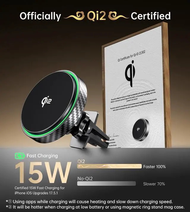 Qi2 Magsafe Car Mount Charger provides Stable 15W Function compared to non-Qi2 Car Mount.
