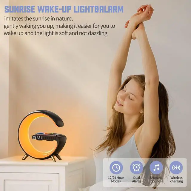 • Multi Functional Wireless Charger Atmosphere LampIt is not an atmosphere lamp, but also has 15W fast wireless charging, Bluetooth speaker, music , sleep lamp, sunrise wake-up lamp, atmosphere lamp, bedside lamp, dazzling light effect, Bluetooth audio, clock, alarm clock, etc. You can use this great light when working, studying, reading and sleeping. Its very convenient.