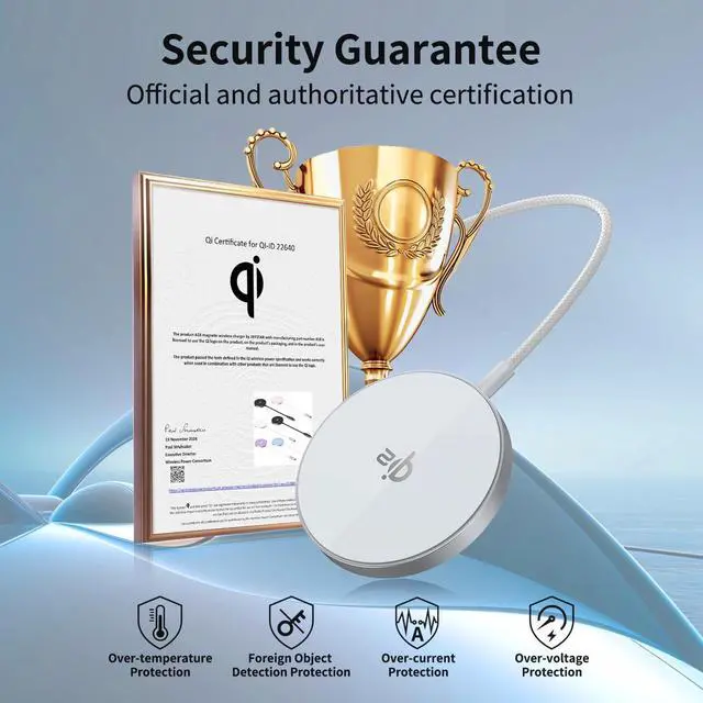 Qi2 Certified & Advanced Safety Our Qi2-certified wireless charger iphone ensures safe, stable, and efficient charging with built-in overcharge, overcurrent, overvoltage, and overheating protection. The smart chip automatically adjusts power to prevent battery damage, making magnet iphone charger a reliable choice for daily use. No bright LED lightsideal for nightstand or office use without sleep disruption.