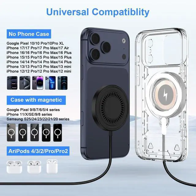 iPhone Magsafe Charger 2 Pack2026 Upgrade magsafe wireless charger full compatibility with iPhone 17e/17/16/15/14/13/12 Series and Airpods. No compatibility warnings works perfectly with all iOS updates, avoids charging issues caused by system updates. This magsafe charger designed specifically for iPhone 17 Pro Max/17 Pro/17/17 Air/ 16 Pro Max/16 Pro/16/16 Plus/ 15 Pro Max/15 Pro/15/15 Plus/14 Pro Max/14 Pro/14/14 Plus/13 Pro Max/13 Pro/13/13 Mini/12/12 Pro/12 Mini/12 Pro Max, AirPods Pro 4 3 2 and MagSafe Charger-adapted official case, and also supports iPhone 8 and above models (requires Mag-Safe protective case)