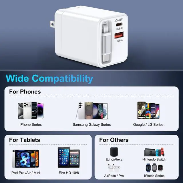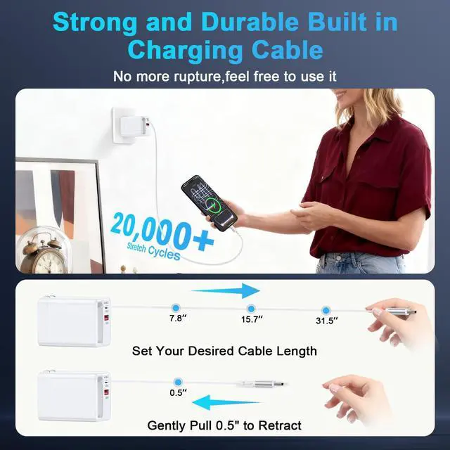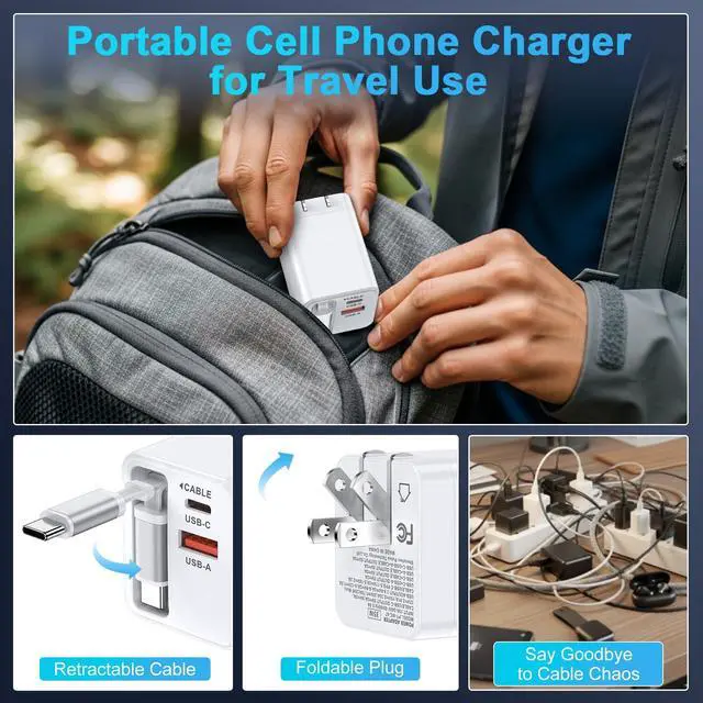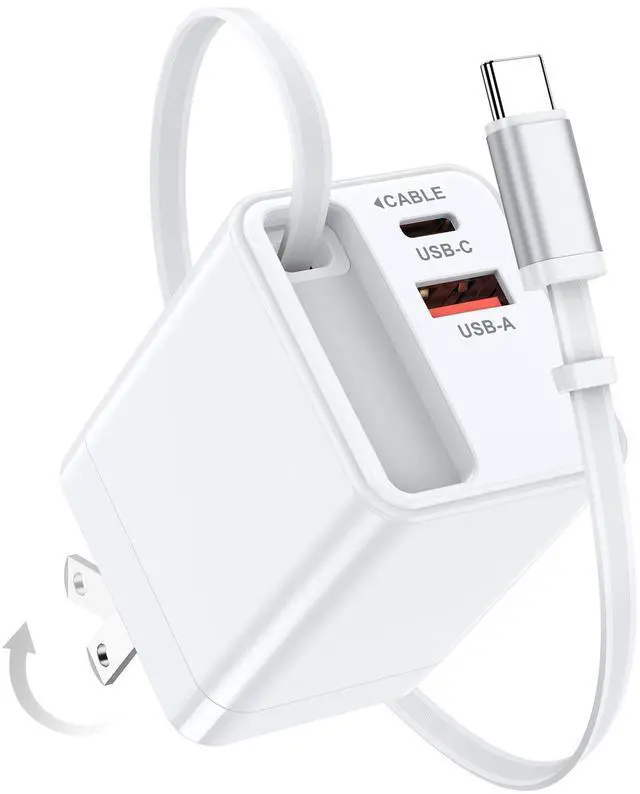 3-in-1 Fast Charger for 3 Devices: The retractable wall charger with foldable plug has USB C/USB A output and a retractable usb c cable.