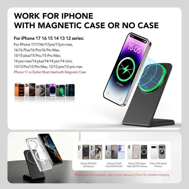 Compatible with the following Apple iPhone models:iPhone 17, iPhone 17 Pro, iPhone 17 Air, iPhone 17 Pro Max, iPhone 16, iPhone 16 Pro, iPhone 16 Plus, iPhone 16 Pro Max, iPhone 15, iPhone 15 Pro, iPhone 15 Plus, iPhone 15 Pro Max, iPhone 14, iPhone 14 Pro, iPhone 14 Plus, iPhone 14 Pro Max, iPhone 13, iPhone 13 Pro, iPhone 13 Pro Max, iPhone 12, iPhone 12 Pro, and iPhone 12 Pro Max., plus AirPods 3/Pro/Pro 2. To ensure a better experience and precise magnetic alignment, a magnetic phone case or no case is required. Not compatible with standard cases.