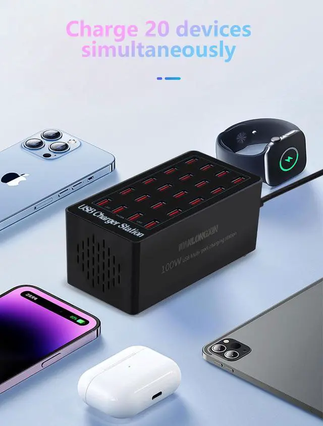 CHARGING STATION FOR MULTIPLE DEVICES The charging station (100W 20-Port USB charging station) provides fast charging for all your 5V devices. This multi USB charging station is perfect for households and businesses with multiple gadgets