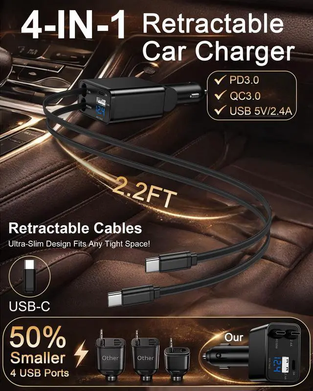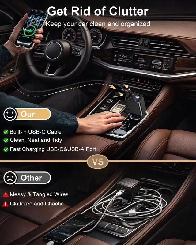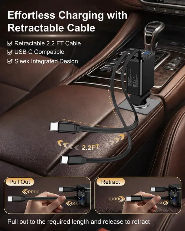 3. The End of Car Cable Chaos: Revolutionary retractable system: Built-in dual USB-C retractable cables (2.2ft), one-pull retraction, and a clean, professional look to eliminate dashboard clutter.