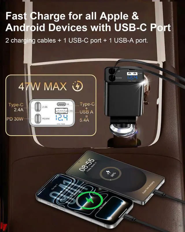 1. 47W All-in-One Retractable Car Chargerthe ultimate cable-free solution combining max power, organization, and universal compatibility.