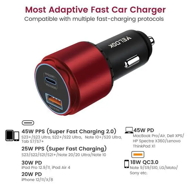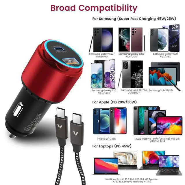 ![Alt view image 5 of 7 - Super Fast Type C Car Charger [73W Turbo], Fast Adaptive 55W 45W PPS/PD&QC3.0 USB C Car Adapter[Super Fast Charging 2.0]for Samsung S26/S25 Ultra/S24 Ultra/S23 Ultra/S22+/S21/S20, iPad Pro(Red)](https://c1.neweggimages.com/productimage/nb640/C56DD2604250Z2CBHC6.jpg)