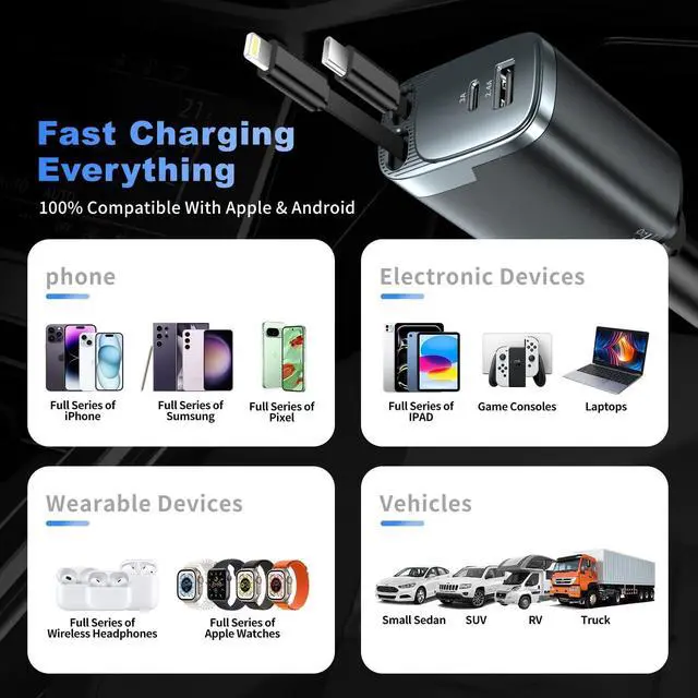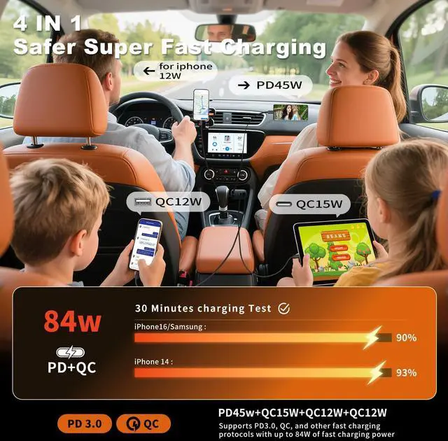 84W 4 Port Car Charger: Equipped With a Real PD/PPS 45W USB C retractable cableSupports Samsung Super Fast Charging and delivers the fastest possible charging speed for Apple devices, a 12W iPhone retractable cable, and additional USB-C and USB-A ports, This Powerhouse Charges up to Four Devices Simultaneously. Ideal for Fast Charging the iPhone 16 Pro Max/Samsung, or Other Gadgets, Its Versatile Enough for Truck Accessories or Stylish Car Essentials. Its Smart Power Distribution Maintains High Speed Charging Across All Ports. Retract Instruction: Pull and Hold the Cable, Gently Extend 1 cm More, Then Release for Automatic Retraction