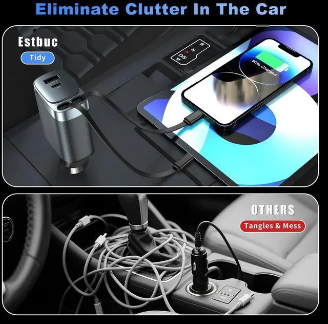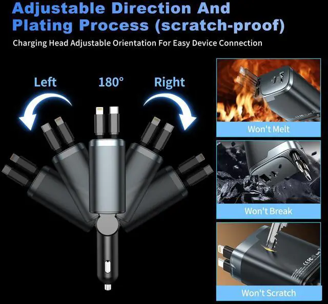 Upgraded 4 in 1 Retractable Car Charger: The 4 in 1 retractable car charger Combines a Compact Design With Powerful Performance, Its 180° Rotating Plug fits Standard 12V-24V Vehicle Sockets. The Retractable Cord Extends up to 31.5 inches, car charger includes 2 retractable cable(Usb C cable & Ligtning cable), and it retracts back inside automatically for storage, keeping it clean and tidy without cable entanglement, and car organization facilitating convenient control and usage