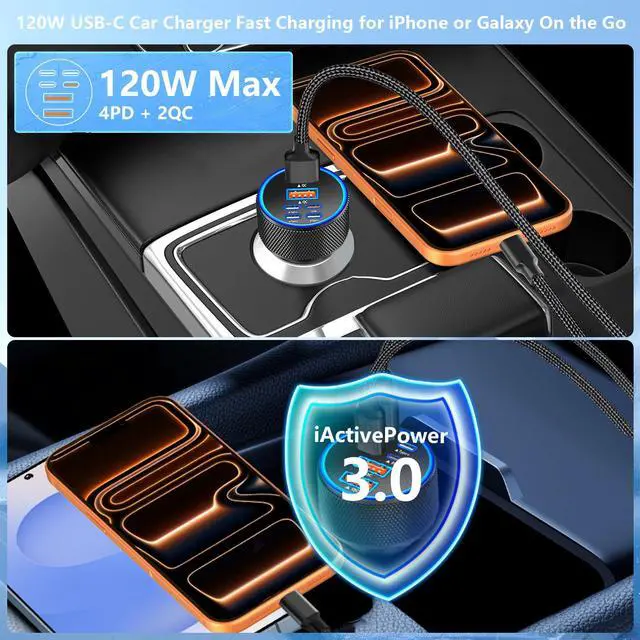 6-Ports 120W USB-C Car Charger Dynamic Power Adapter: KYOHAYA's 120W 4 USB-C & 2 USB-A Car Charger Adopt integrated superconductor material which engineered for reduced resistance, boosting charging efficiency and superior temperature control, fully charge iPhone 17 device 88% in 30mins. Intelligent Power Distribution Tech and E-Marker Chipset work in tandem to lower power consumption provides double power density, directly increase the charging speed of your iPhone by 9 times.