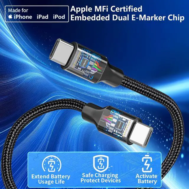 MFi Certified Dual E-Marker Chip Type-C Braided Cable : KYOHAYA's USB-C Braided Cable Built-in Double E-Marker Protection Chip, Thanks to MFi Certified USB-C Cable, it ensures full compatibility with all USB-C devices, Such as: iPhone 17/17 Air/17 Pro/17 Pro Max/16/16 Plus/16 Pro/16 Pro Max/15/15 Plus/15 Pro/15 Pro Max, iPad Pro/Air/Mini, AirPods. Also compatible with Galaxy S26/S25/S24/S23/S22/S21/S20/Note 20/10, Pixel, Moto and more.