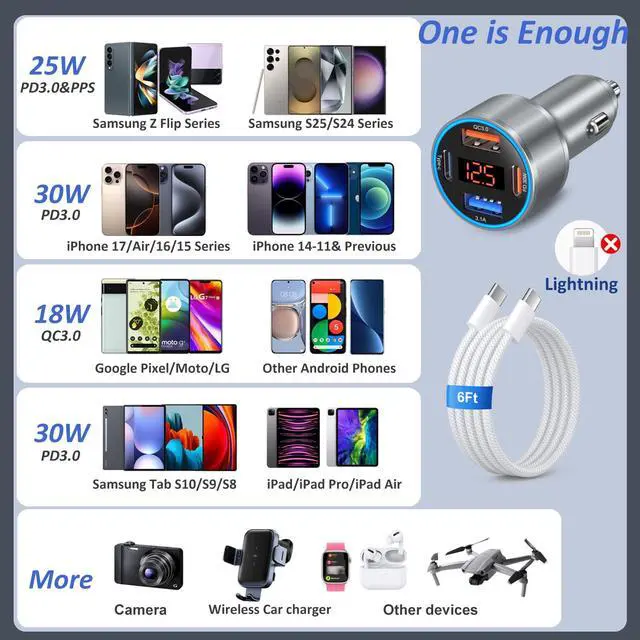 4-in-1 Fast Car Charger: Car usb adapter with 65 watts distributed among 4 car outlets (dual usb-c and usb-a multi car charging port), the car adapter enable you to charge multiple phones at once. Equipped with QC and PD 3.0 fast charging technology, the upgraded 2026 car phone charger can support max 30w power delivery for the latest usb-c devices,like iPhone 17/16e/16 Pro Max and 18w quick 3.0 fast charging for most Android phones.