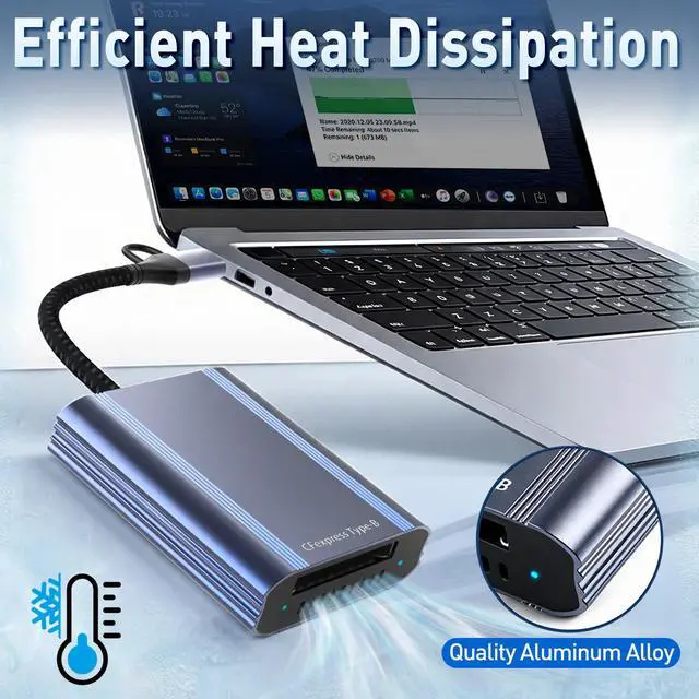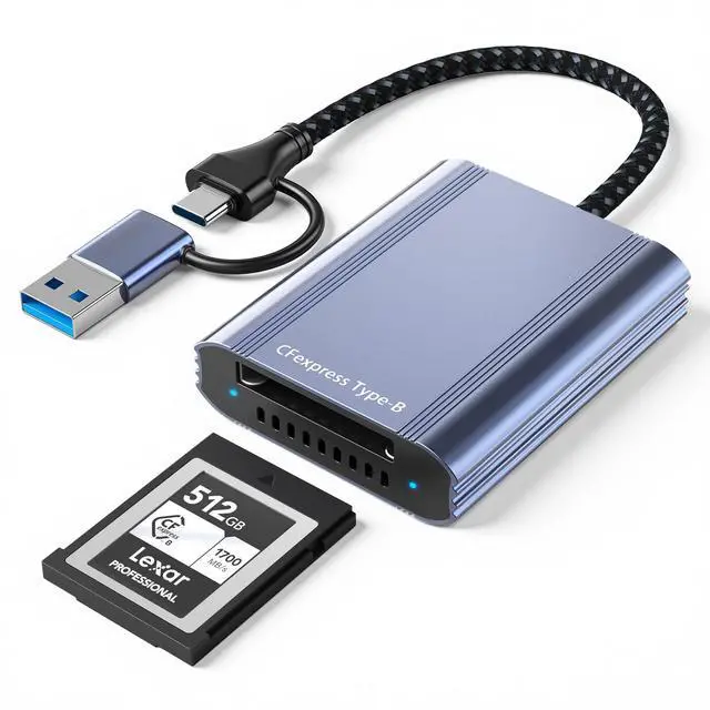 - The cfexpress reader features a premium aluminum alloy body for superior heat dissipation and a rugged braided nylon cable tested to withstand over 10,000 bends.
