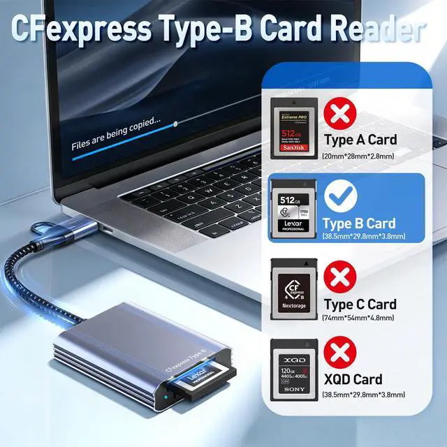 - CFepxpress card reader is specially designed for CFexpress memory card (Type B) and supports USB3.2 Gen2 (10Gbps) super speed data transfer for your CFexpress card.