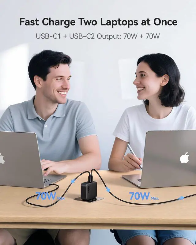 Max. 140W Power Delivery: Baseus 140W usb c charger has Two USB-C ports can deliver up to 140W power when used separately. Easily charge your MacBook from 0% to 100% in 97 mins. You can use those two ports to fast charge two MacBooks, with each output delivering up to 70W. Convenient fast charging for offices or travel.