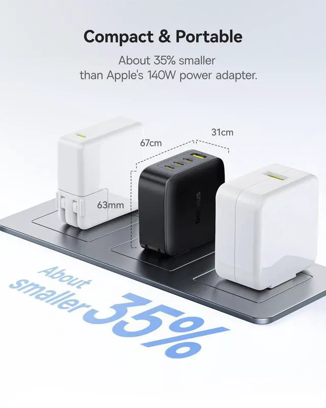 Compact & Portable: This portable charger is approximately 35% smaller than Apple's 140W power adapter. It's extremely convenient for everyday carry and travel. The foldable prongs make sure that it won't scratch your bag or items inside and it won't take up much space in your backpack, luggage, or pocket.