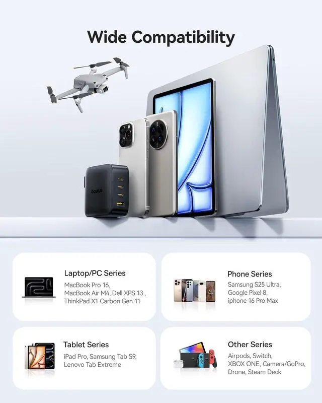 Wide Compatibility: The laptop charger supports multiple fast charging protocols including PD3.1. Compatible with iPhone, iPad, Samsung phones and tablets, Switch, MacBook, drones and other devices.