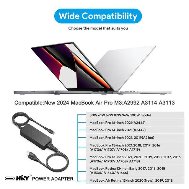 | Compatibility | High-Efficiency Charging Solution for High-Performance Devices likes AI Gaming Laptops MacBook Pro/Air 16" 15" 14" 13" M2 M2 Max,Surface,MSI,Dell,Lenovo,HP,Huawei,XIAOMI Laptop,Asus ROG Ally,Chromebook,Steam Deck & All USB-C and USB-A Port devices | MacBook Pro 16 14 inch,MacBook Air 15 13inch 2024 2023 2022 2021,M1/M2/M3,eero PoE Gateway/Samsung Galaxy Book4 Ultra/Dell XPS 13 15 17, Galaxy,Chromebook,ThinkBook/iPhone 16 / iPhone 15/iPad Pro/mini/Air,Avalon Nano 3 Miner and more USB C devices | eero PoE Gateway / Macbook pro 16 inch,Macbook Air/ Pro series ,Lenovo legion series /Asus ROG series /MSI thin series /MSI Titan series /DELL Alienware series laptop/HP omen series gaming computer laptop, and more AI Gaming laptops with usb-c port | M4 M3 M2 M1 PRO MAX macbook pro 16" 15" 14" & macbook air 15 14 13 inch, ipad pro & air 12.9 11 10.9 inch and all USB C device, laptops and smartphones. Works with USB C 29W, 30W, 61W, 67W, 70W, 87W, 96W PD models & All USB C port devics | MacBook Pro/Air,Lenovo HP Dell Samsung Acer ASUS Toshiba LG Chromebooks, iPad Pro, iPhone 16 15 Pro, Galaxy S25 S24 Ultra,Google Pixelbook,Switch Host, Switch Dock, DJI Mavic 3 / Air 2S, AirPods, Apple Watch, Steam Deck,Note20, Pixel and more | macbook pro 16" 15" 14" & macbook air 15 " 13 inch, ipad pro & air 12.9 11 10.9 inch and all USB C device, laptops and smartphones. Replacement for Macbook charger USB C 29W, 30W, 61W, 67W, 70W, 87W, 96W PD Power Adapter.For Asus ROG Ally X 2024 2023 |