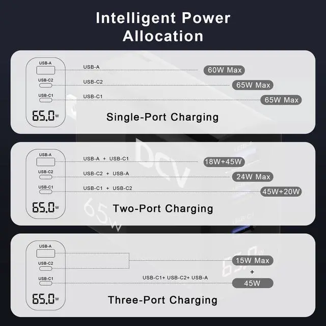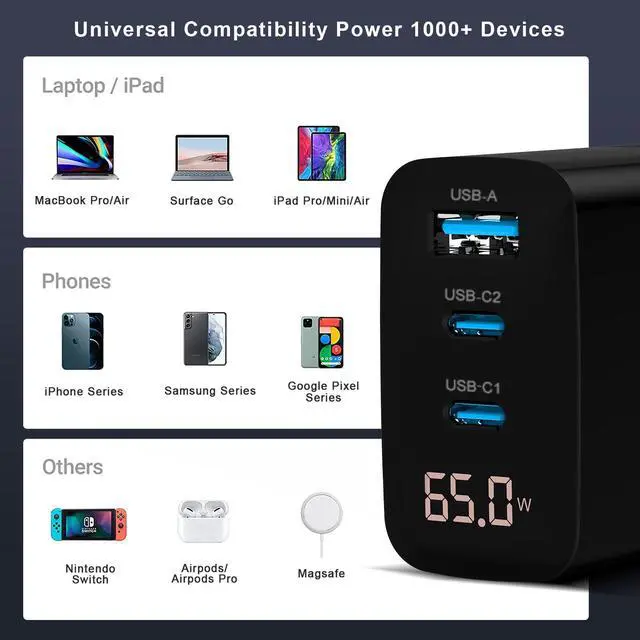 65W High-Speed Single Port Charger: Connect to a single USB-C1 or USB-C2 port to get an impressive 65W Max charging power. High-speed charging for compatible devices such as phones, tablets, and laptops.