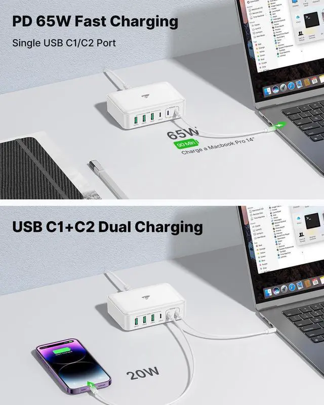 | Single Port Used (USB C1/C2) | PD 65W- 5V=3A, 15W/9V=3A, 27W/12V=3A, 30W/15V=3A, 45W/20V=5A |
