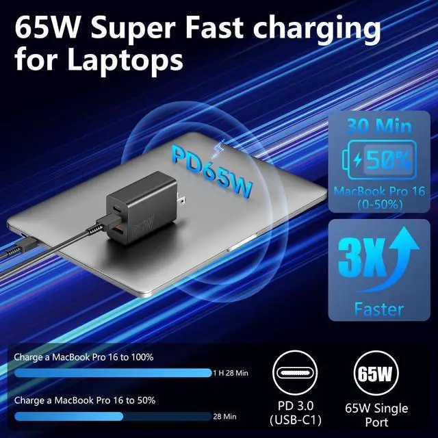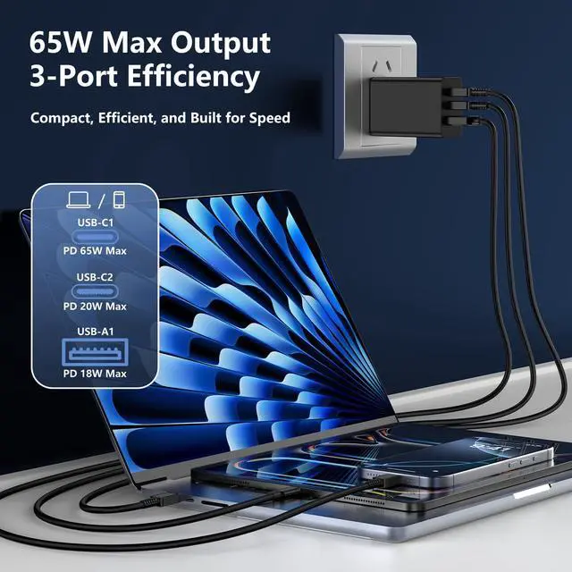 | Output | USB-A:5V-3A;9V-2A;12V-1.5A 18W Max / USB-C1:5V-3A;9V-3A;12V-3A; 15V-3A; 20V-3.25A 65W Max/USB-C2:5V-3A;9V-2.22A;12V-1.67A 20W Max |