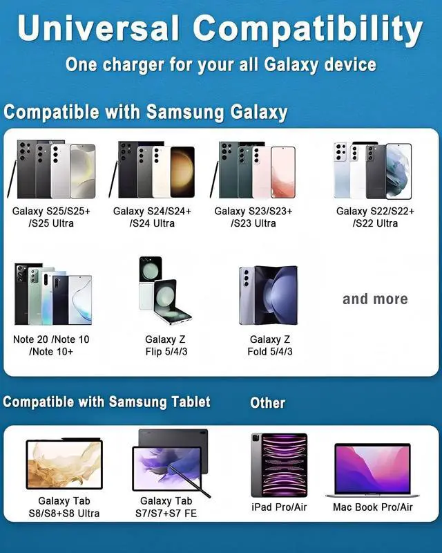 | Compatible with Samsung Galaxy | S10/S10+/ Galaxy S10e,Tab S8/ S8+/S8 Ultra/S7/S7+/ , Galaxy Watch and more since note 8/s8 |