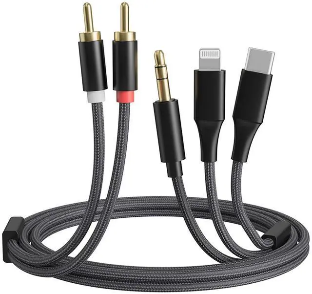 3-in-1 RCA Audio Cable One Cord for All: Connect your devices effortlessly with Lightning, USB-C, and 3.5mm to RCA. This single cable works as an iPhone to RCA audio adapter, a USB C to RCA audio cable, and a 3.5mm to RCA aux cable, saving space and hassle.